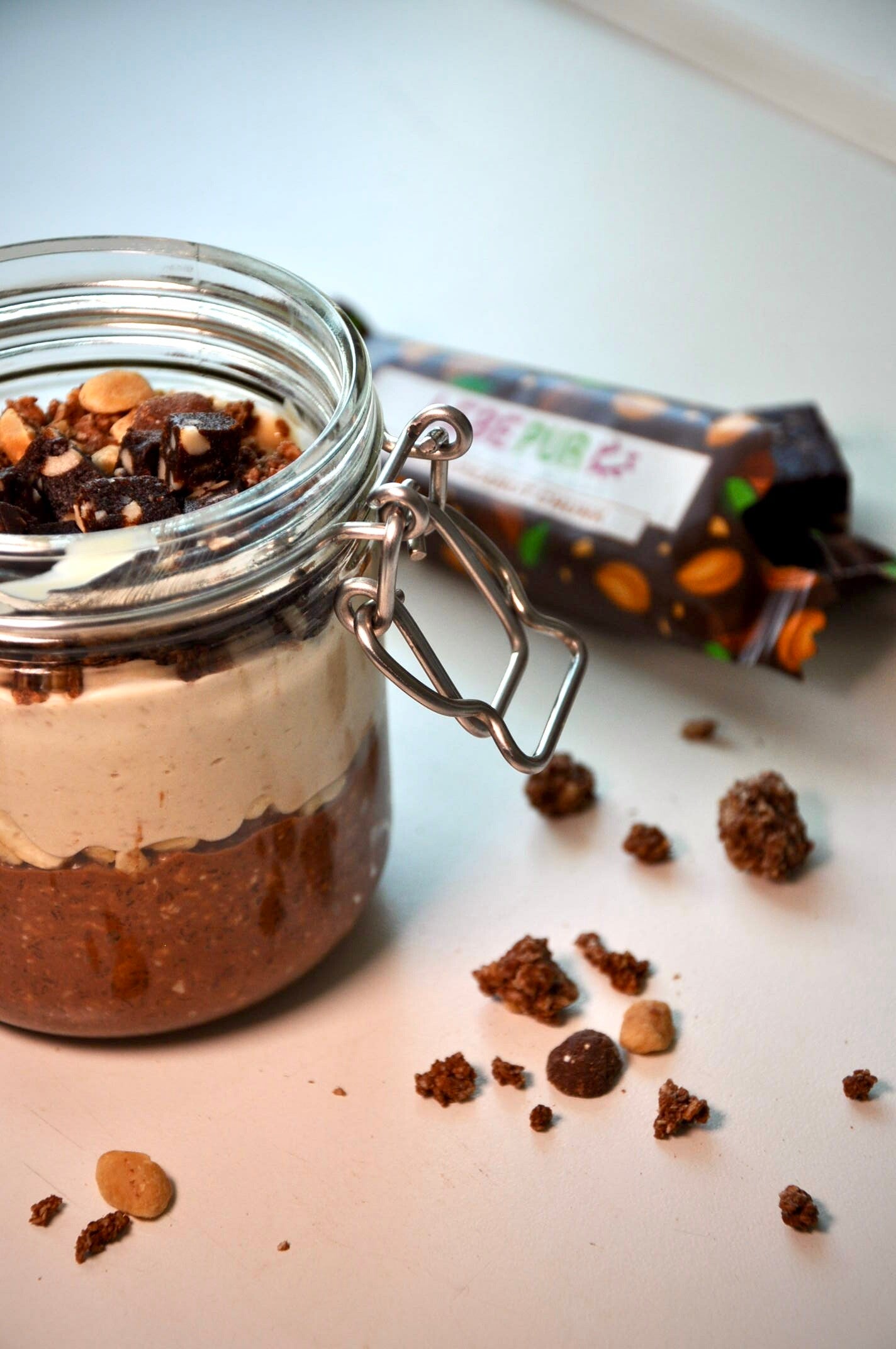 Alle Zutaten für die Oats zusammenrühren, in ein Glas geben und mit den gehackten Erdnüssen bestreuen.