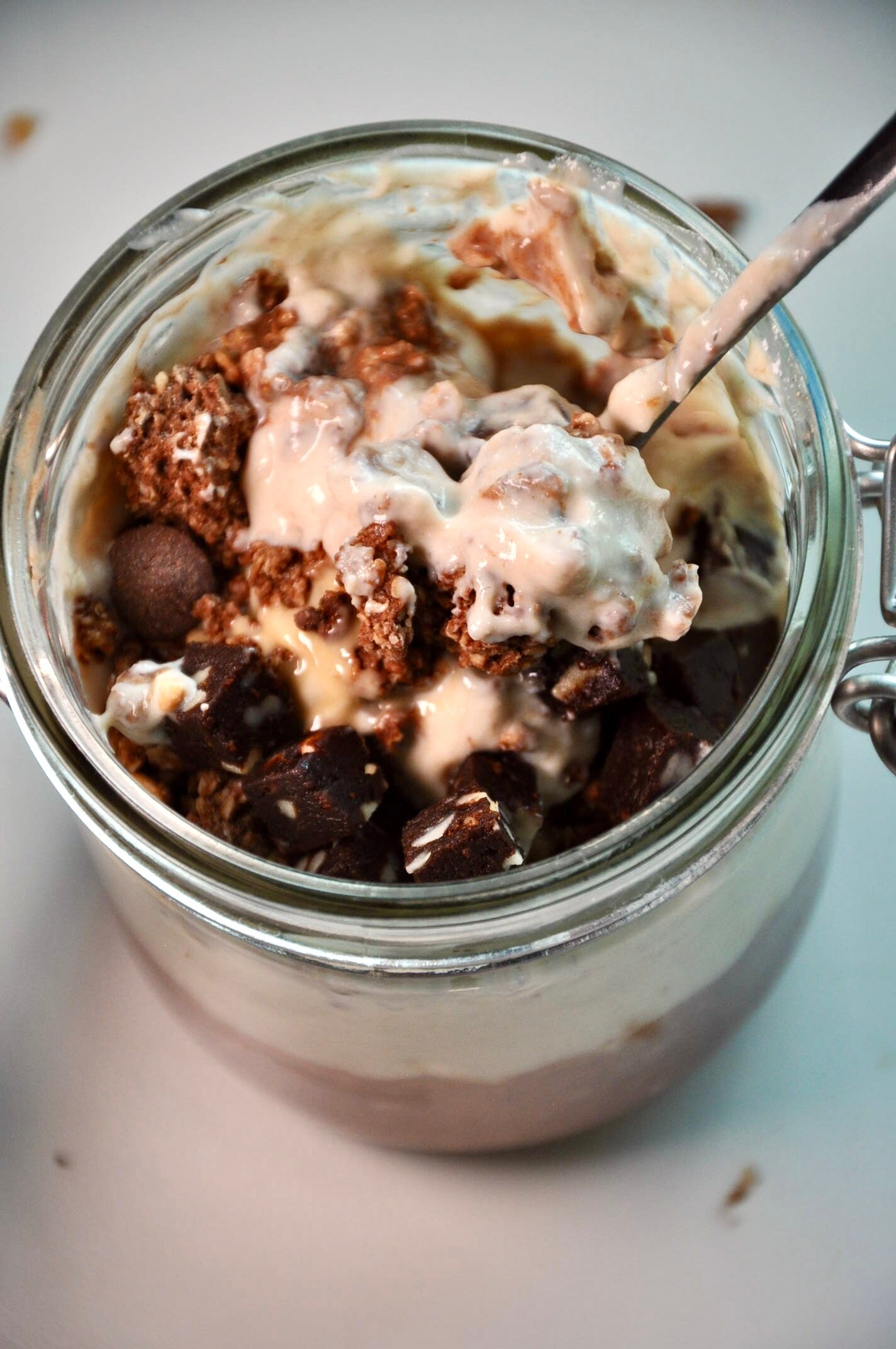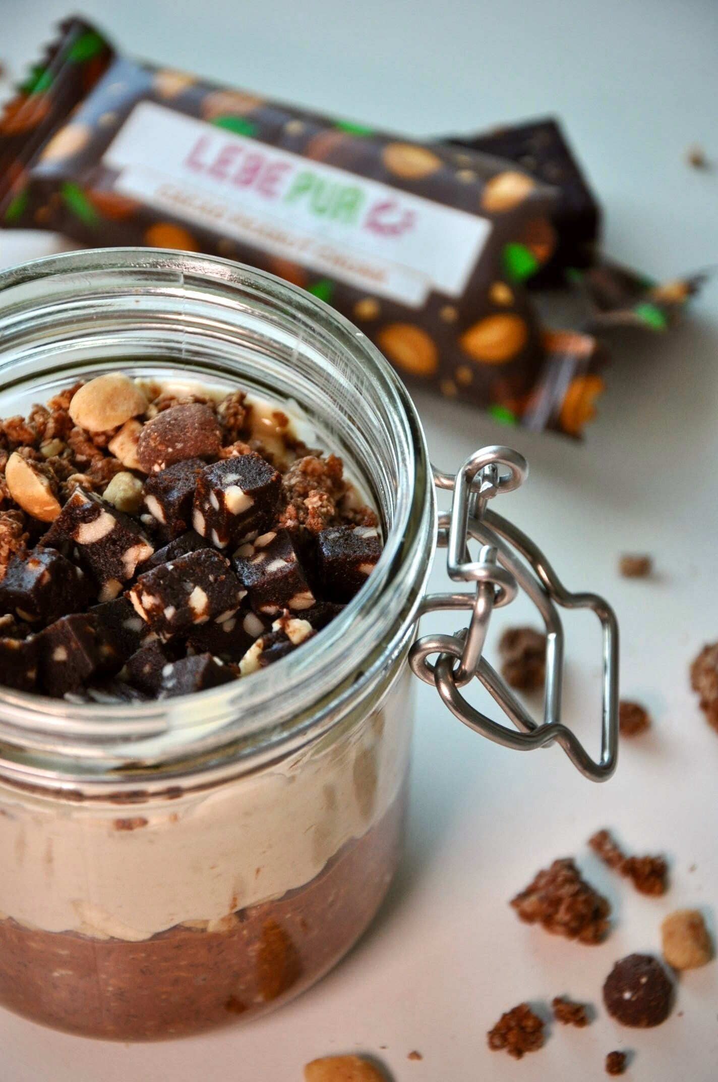 Als Toppings Erdnussmus, Granola und den zerkleinerten Schokoriegel über die Creme geben.