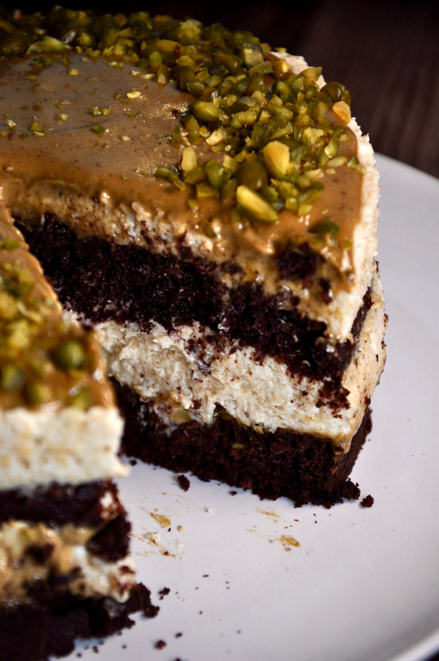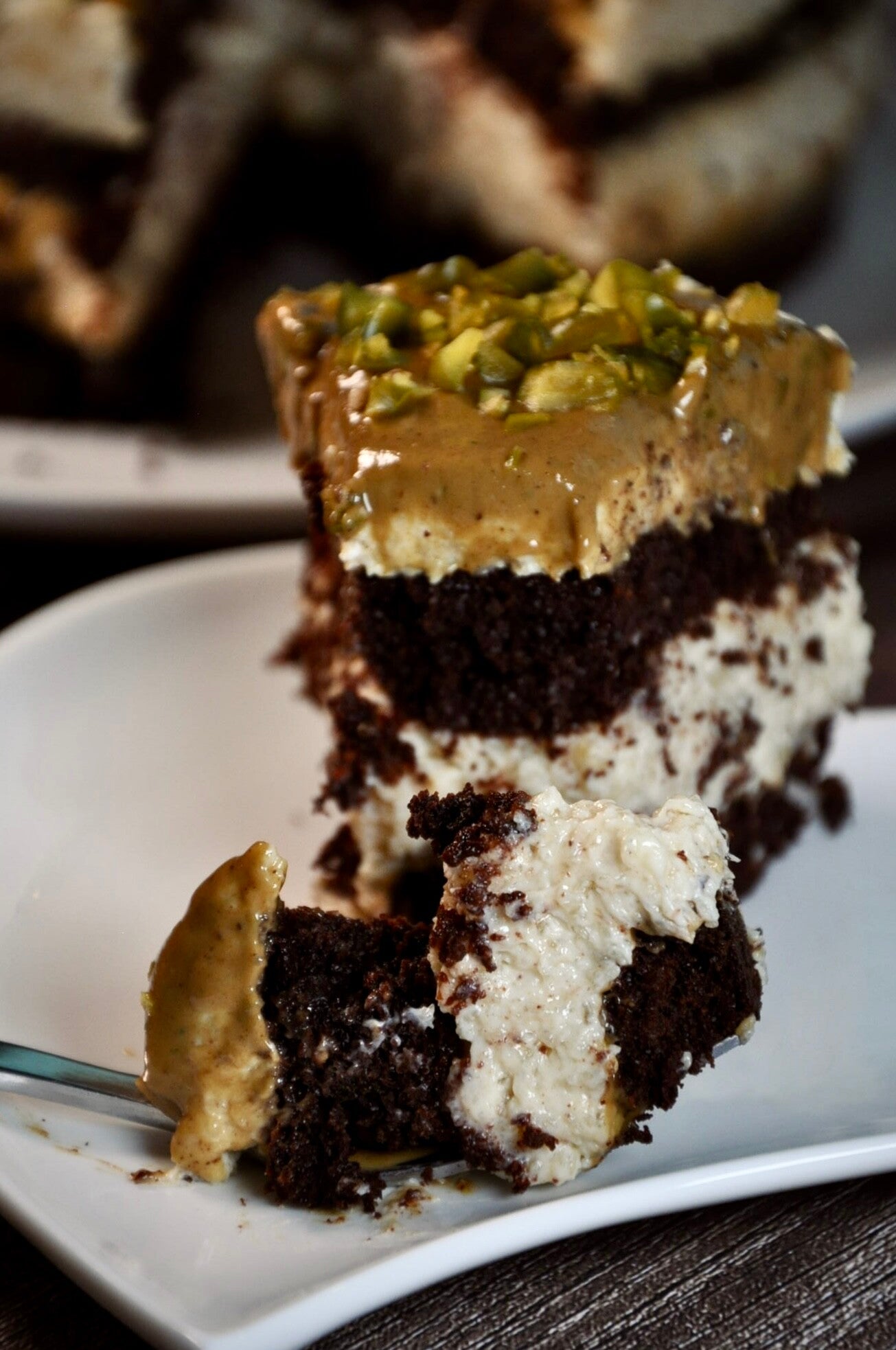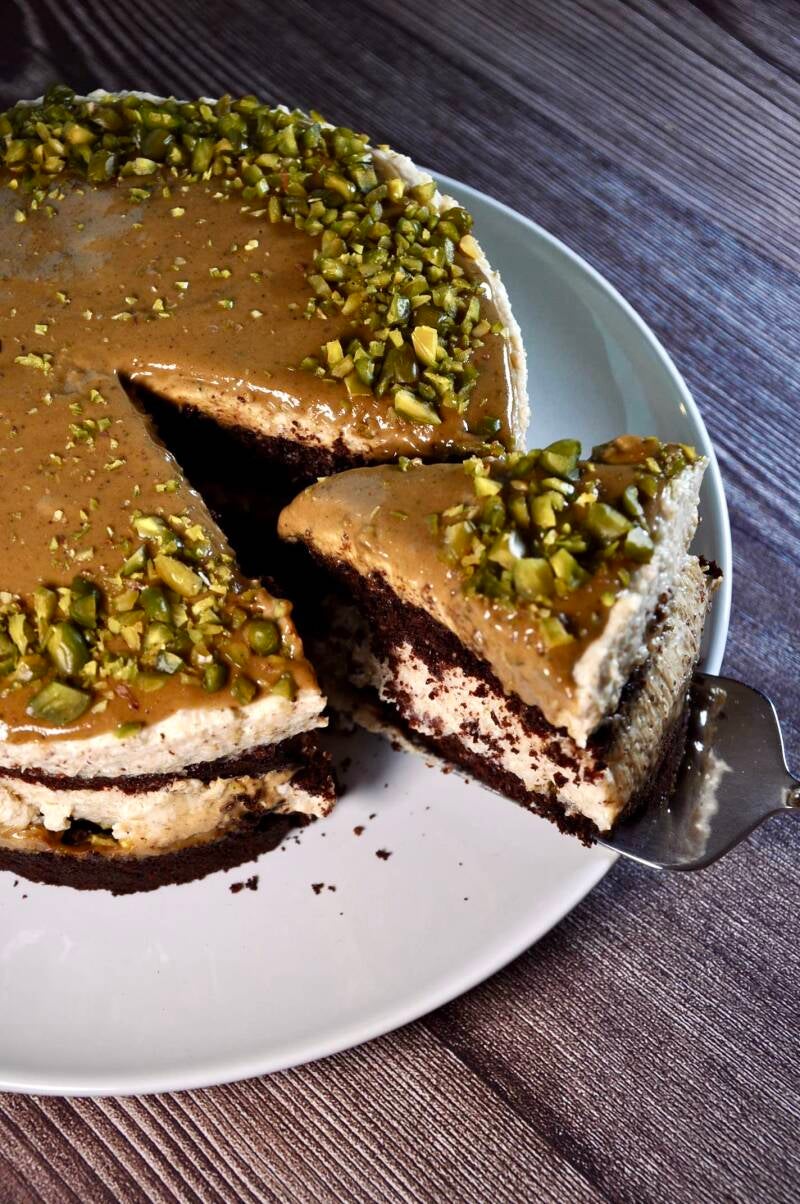 Den erkalteten Brownie-Boden vorsichtig aus der Springform lösen und mit einem Brotmesser horizontal in zwei Hälften schneiden. Den unteren Boden wieder in die Springform geben und die Hälfte der Pistaziencreme darauf verteilen. Mit der Hälfte der gehackten Pistazien bestreuen, dann etwa 3/4 der Cheesecakemasse darauf verteilen. Den zweiten Brownie-Boden darüber legen und wiederum mit dem Rest der Cheesecakemasse bedecken. Zuguterletzt die übrige Pistaziencreme auf der Oberfläche verteilen und Glattstreichen. Mit Pistazien toppen und den ganzen Kuchen für mindesten drei Stunden kalt stellen.