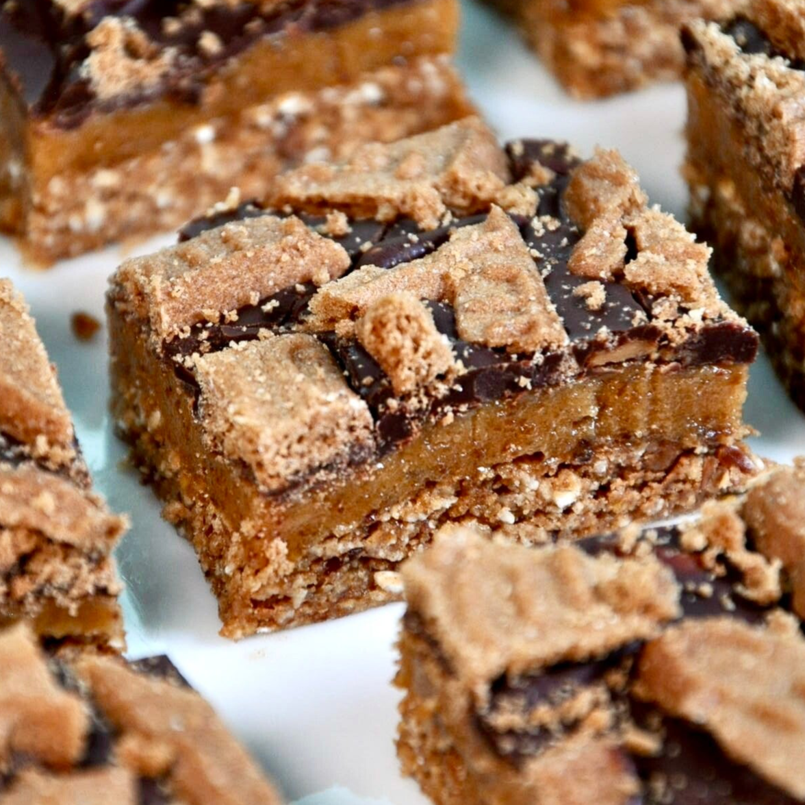 Die Schokolade schmelzen und mit dem Mandelmus vermengen. Diese Glasur nun über die zwei vorherigen Schichten geben, die Spekulatius zerbrechen und mosaikartig auf der Schokoladenschicht verteilen. Kurz leicht aushärten lassen, dann mit einem warmen Messer in 18 Schnitten schneiden.