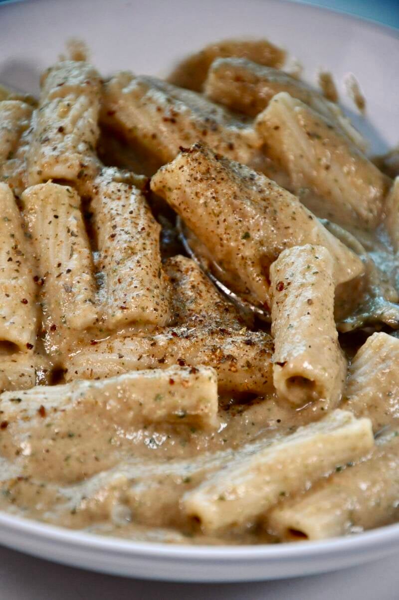 Die cremige Gemüsemischung aus der Pfanne zusammen mit dem Nudelwasser in einen Mixer geben und zu einer Sauce pürieren.
