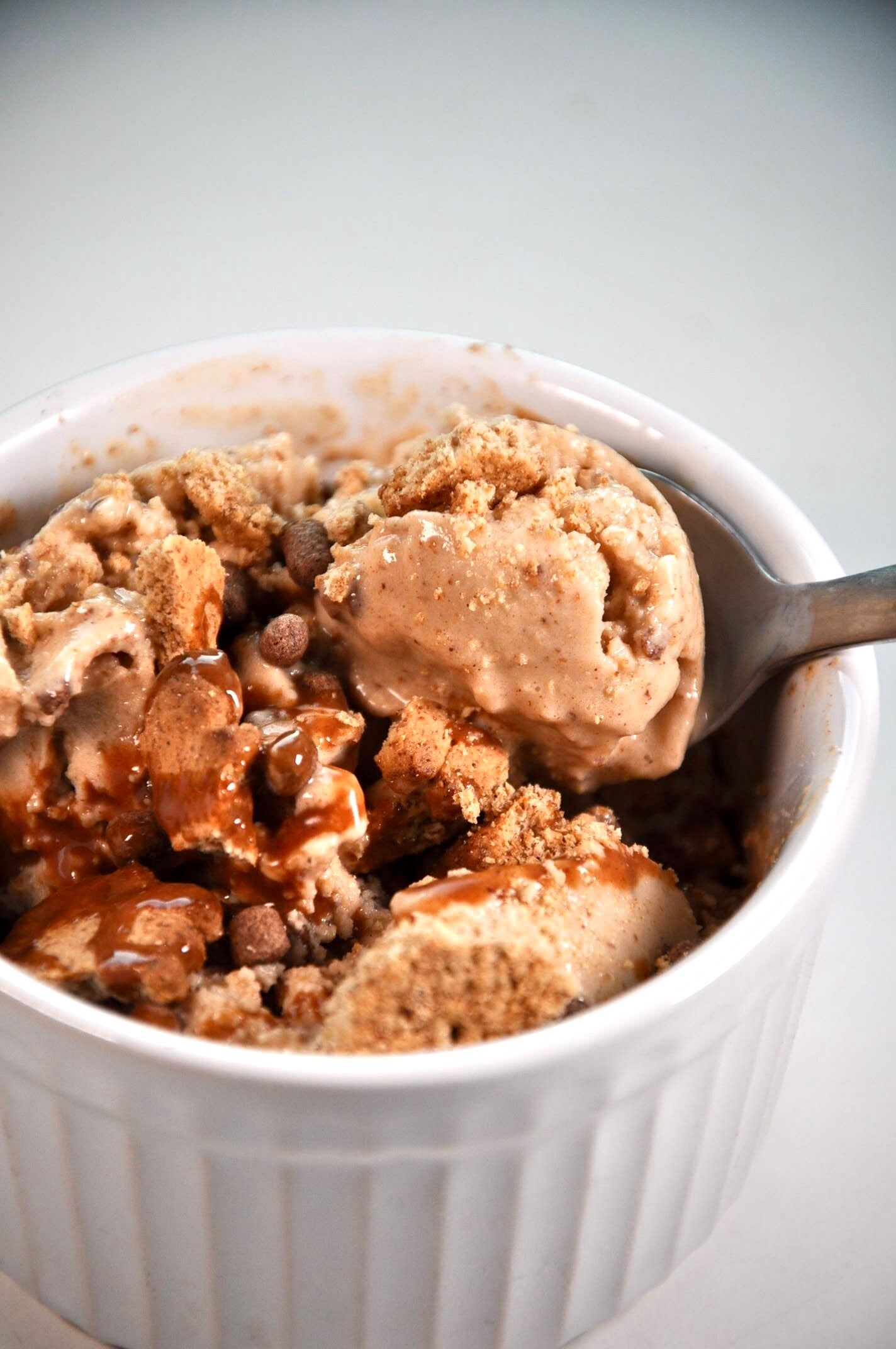 Am nächsten Tag den gefrorenen Cup in den *Ninja Creami geben und 2 Minuten zu "Ice Cream" verarbeiten. Optional noch einmal auf "Re-Spin" wiederholen. Ist die Konsistenz krümelig, gebt etwas Haferdrink hinzu, bis das Eis die gewünschte cremige Textur hat. Jetzt die Mix-Ins dazu geben und auf "Mix-Ins" unterrühren.
